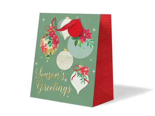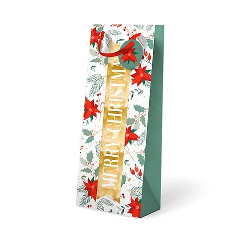in stockPresent your fine wine or tall gifts in this stunning White & Gold Poinsettia Bottle Bag. The classic design features vibrant red flowers, fest...