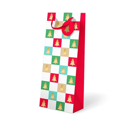 in stockBrighten any bottle gift with this fun, contemporary Checkerboard Christmas Tree Bag. Featuring a lively pattern of red, green, teal, and gold squa...