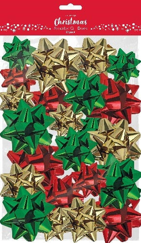 in stockFinish your gifts with a flourish! This pack includes 20 festive star-shaped bows in shimmering red, green, and gold. They’re self-adhesive and com...