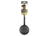 This slotted spoon skimmer is a functional tool for everyday cooking. It features a wide, perforated head designed to drain liquids quickly while lifting solid foods from pots or pans. The handle is finished with a wood-look texture for a comfortable grip and includes a hanging hole for convenient storage. The black nylon head is heat-resistant and suitable for use on non-stick cookware.