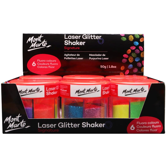 Our Signature Laser Glitter Shakers have 6 compartments with an exciting variety of vibrant, fluoro colours. The shaker lid has two differing holes, similar to a spice jar, one is wide so that you can pour large amounts of the glitter out and the other has numerous small holes, so that you can shake the glitter out in small amounts. The lid is easily sealed by turning it, so that no holes are open, making it a mess-free, compact and portable jar to take with you wherever you go.